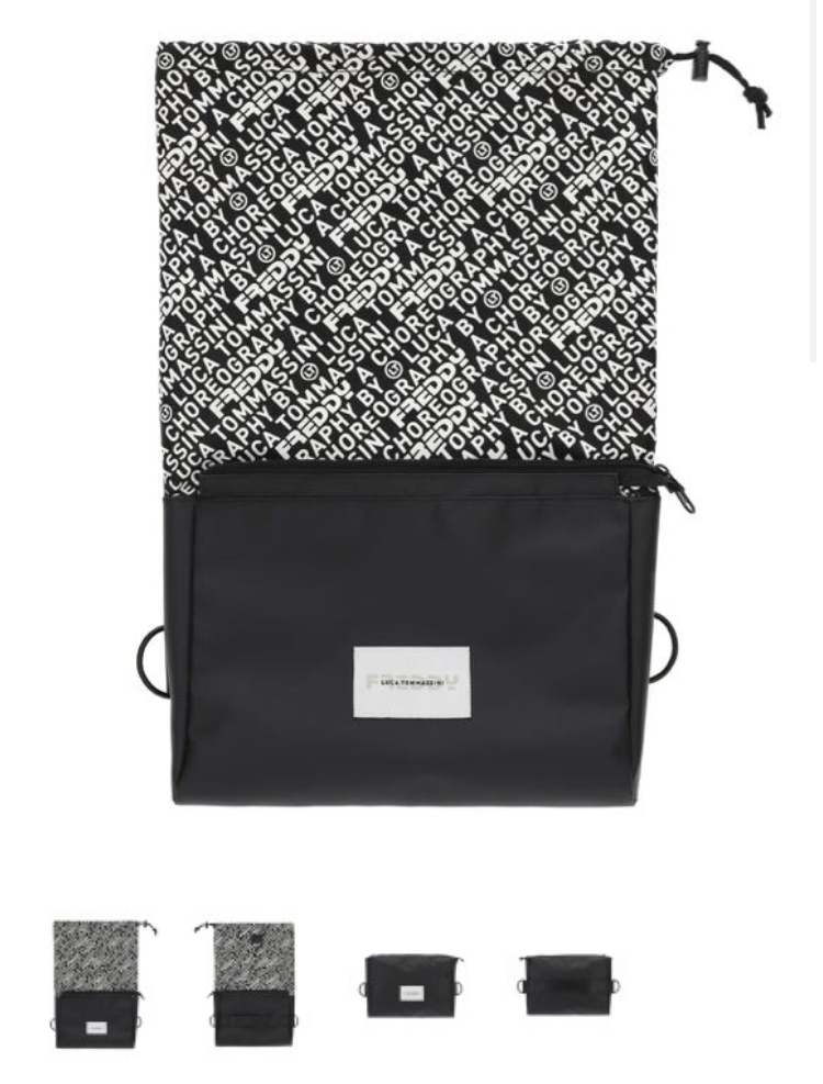 オープンで、ドローストリングが閉じた実用的なシティバックパックで、「FREDDY A Choreography byLucaTommassini」のテクスチャが全体にデザインされています。