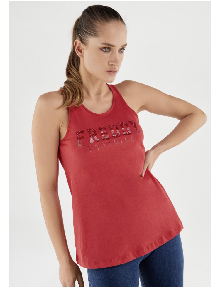 フロントにトーンオントーンのカモフラージュFREDDY TRAININGが施された快適なタンクトップ。 後ろにはラバーバンドが生地を集めてカットを飾り、移動時の安定性も確保しています。