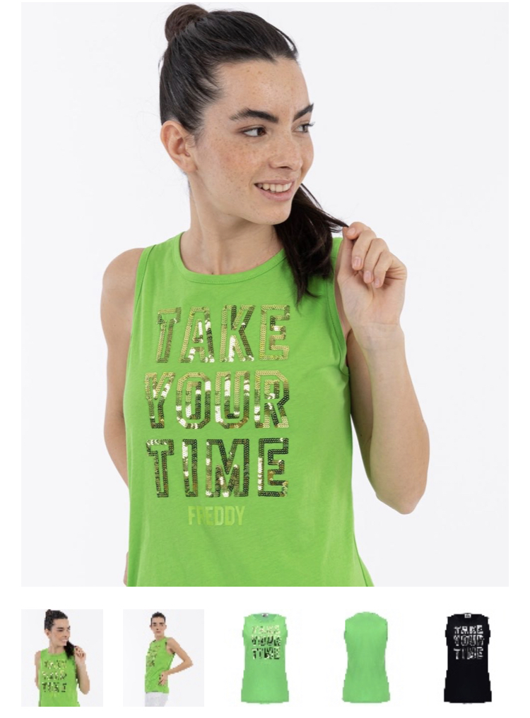 全面には大きく「TAKE YOUR TIME」という文字がスパンコールでかたどられています飾られています。