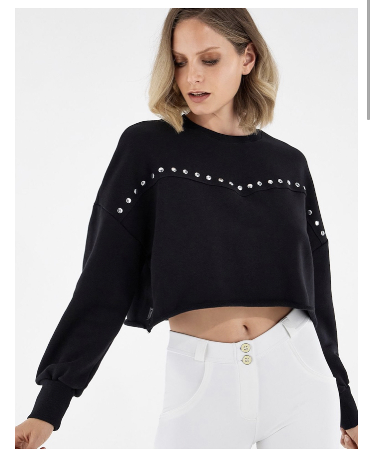フロントヨークに沿って走るシルバースタッドの列で飾られた柔らかいコットンフレンチテリーのダンサブルなクロップドシャツ。 モデルは、クルーネックライン、リブ編みの袖口を備えた長袖、生のカットの裾、快適なフィット感を備えています。 滑らかなデザインと生地の柔らかさを組み合わせることで、様々な場面で着心地の良さと動きの自由度を感じさてくれます。