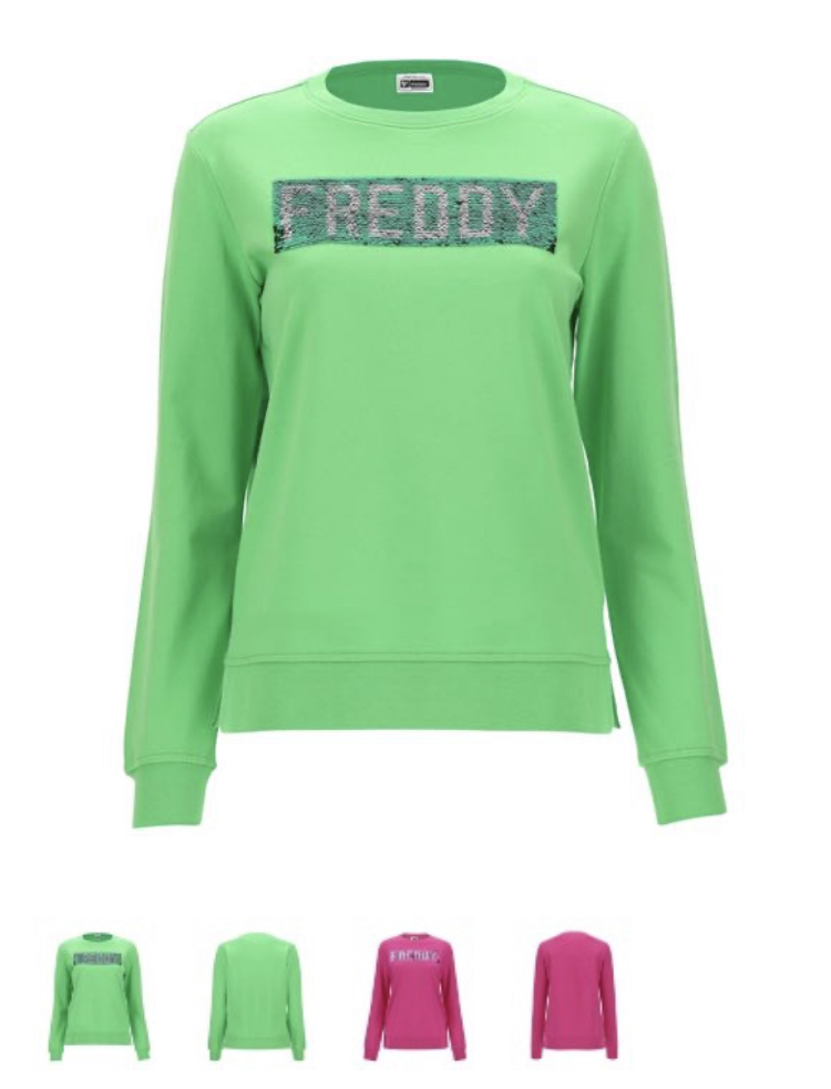 レギュラーフィットの軽いフレンチテリーのクルーネックスウェットシャツ。 袖口と裾にリブが付いたベーシックなデザイン。 胸には2色のスパンコールでフレディのロゴが飾られています。 綿100% F49:ピンク D79:グリーン W:ホワイト N:ブラック