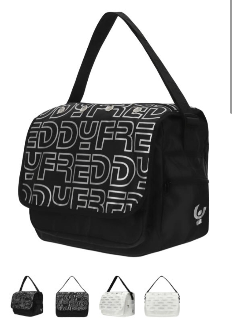 September 25, 2020 バック フラップ付きブラックショルダーバッグ、メインコンパートメントのファスナー、フロントとサイドの便利なポケット。 フラップには通気用の穴があり、繰り返し反射するシルバーマキシFREDDYロゴの柄でデザインされてます。 調節可能なショルダーストラップ。 寸法:L 39 x H 31 x 19 W cm。 100%ポリエステル