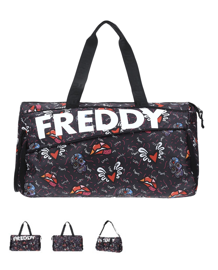ロメロブリットコレクションの象徴的なハートのモチーフが全面にデザインされたナイロン製の大きなジムバッグのニューモデル。キュービズム、ストリートアート、ポップアートを組み合わせた多才なアーティストロメロが署名した表現力とポジティブなエネルギーに満ちたコレクションです。 サイドのブリットのシグネチャーとバックのFREDDYロゴが、アートとアクティブウェアの活力を融合させた、この広々とした実用的なバッグをスタイリッシュに完成させます。 メインのジッパークロージャー、大きなフロントコンパートメントもジッパーで閉じられ、シューズが収納できるメッシュのディテールが付いたサイドポケットが付いています。 ダブルハンドルと調節可能で取り外し可能なショルダーストラップが特徴で、肩に快適に持ち運びできるように柔らかな補強が施されています。