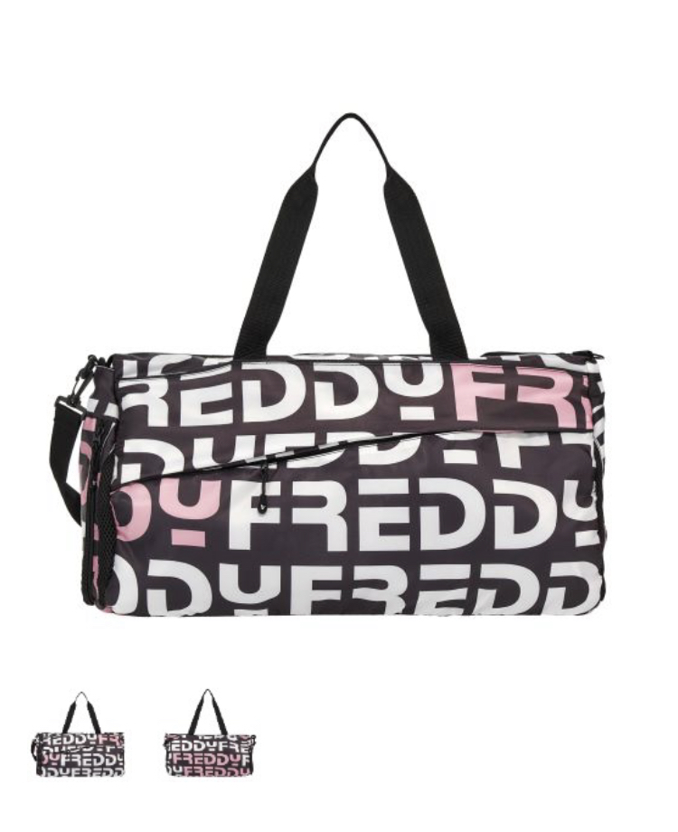 2色のコントラストに全体にFREDDYブランドロゴを繰り返しでデザインされたジムバック。