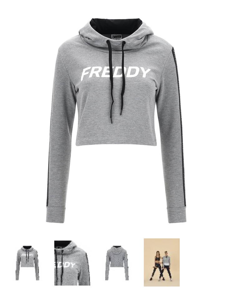 フロントにホワイトのFREDDYをあしらったクロップドパーカー、両袖にゴールドカラーのロゴが入ったブラックのジャカードリボン。 こちらのモデルはレギュラーフィットで、調節可能なドローストリング付きのブラックメッシュのダブルフードとストッパー付きのストレートヘムが特徴です。