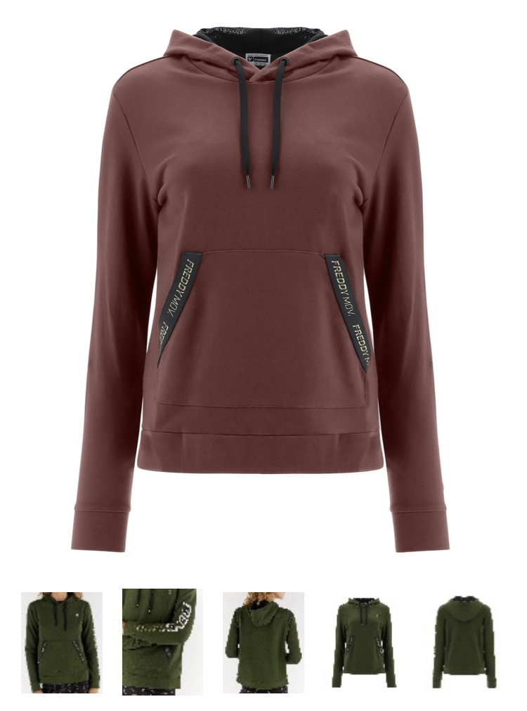 片方の袖にFREDDY MOVのホワイトとゴールドのキラキラで装飾されたフード付きパーカー。ポケットの縁にゴールドのFREDDYロゴが入ったブラックジャカードリボンが付いています。 こちらのモデルは引きひも調整可能なメッシュで裏打ちされたフード、フロントにカンガルーポケットのレギュラーフィットパーカーで、 ストレッチブラッシュドフリースの柔らかくしなやかな生地が機能的なデザインに加わり、動きに快適さと振幅を与えます。スタイリッシュなディテールがスポーティなスピリッツを込めたウエアは、ワークアウトにだけでなく、動きの自由度が必要なダイナミックなフリータイムのウエアとしてもおすすめです。