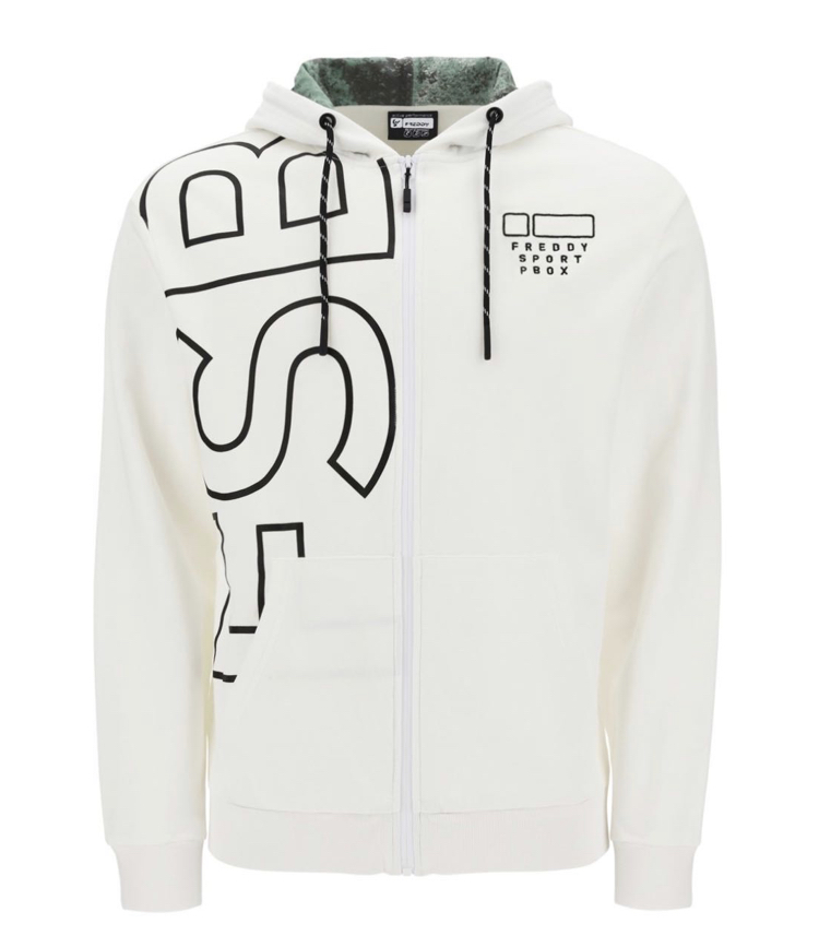 April 4, 2020 フルジップパーカー 引き紐つき柔らかいフードのジップアップスウェットシャツ。 フードの内側が緑の色合いで印刷された生地で二重になっています。 白抜き特大ロゴによって側面に飾られています。 袖口と裾にリブ、フロントに使い勝手の良いカンガルーポケットがあります。 左胸にはフレディマンラインのロゴなしの下にはFREDDY SPORTS BOXとプリントされ、背面右上には小さめのFSBのプリントがおしゃれです。 綿100