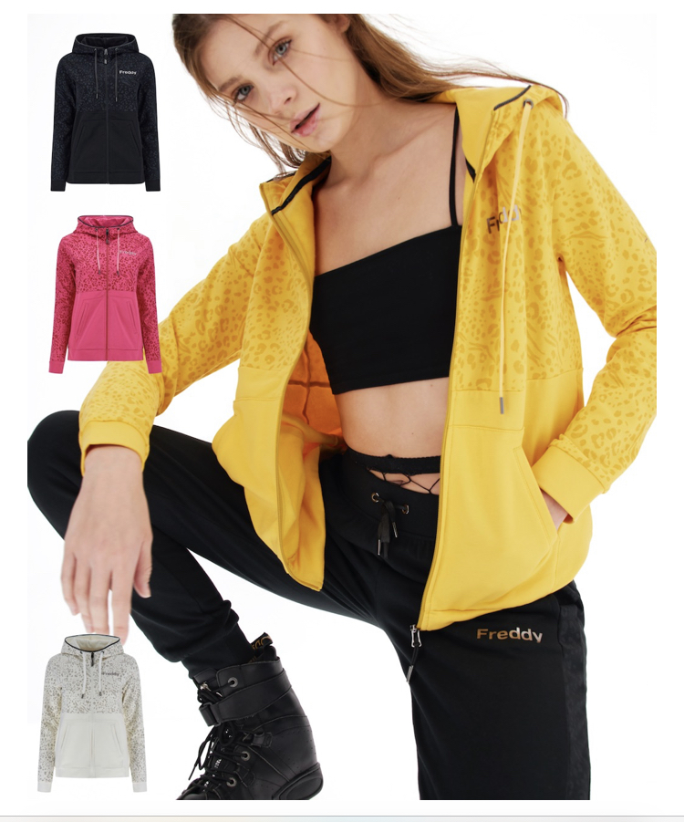 アニマル柄のグラフィックが施されたフードと袖の上部と、その他の部分の単色使いが特徴的なフルジップパーカーです。ラメ入りパイピングで縁取られたドローストリング付きのフード、フロントのカンガルーポケット、袖口と裾にサイドスリットが入ったモデルです。片袖と前身頃には、シャイニーメタルのガンカラーグラフィックを施し、全体の印象を引き締めています。体のラインに柔らかく沿うレギュラーフィットに、包み込むようなストレッチ素材のガーゼスウェットを織り交ぜ、快適さと自由な動きやすさを優先しています。
