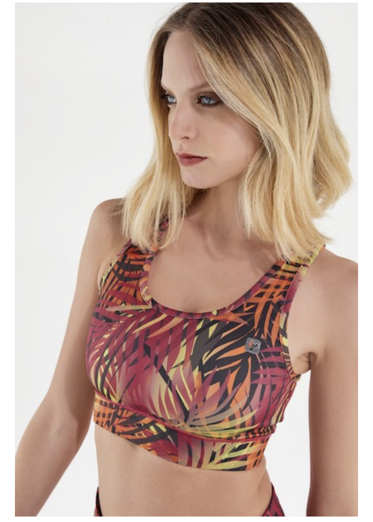 トロピカルパターンのD.I.W.O.®通気性テクニカルファブリックでミディアムサポートのスポーツブラ。