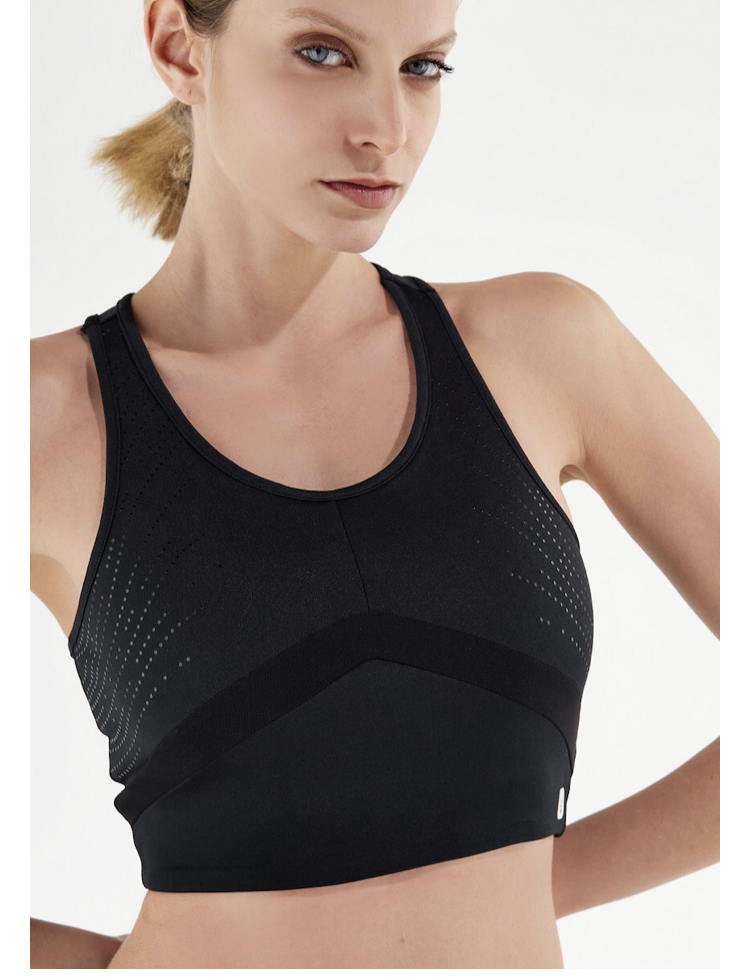 この洗練されたオールブラックのアクティブウェアのブラトップは、そのステイプットデザインのおかげで、ワークアウトやその他の激しいスポーティなアクティビティに最適です。