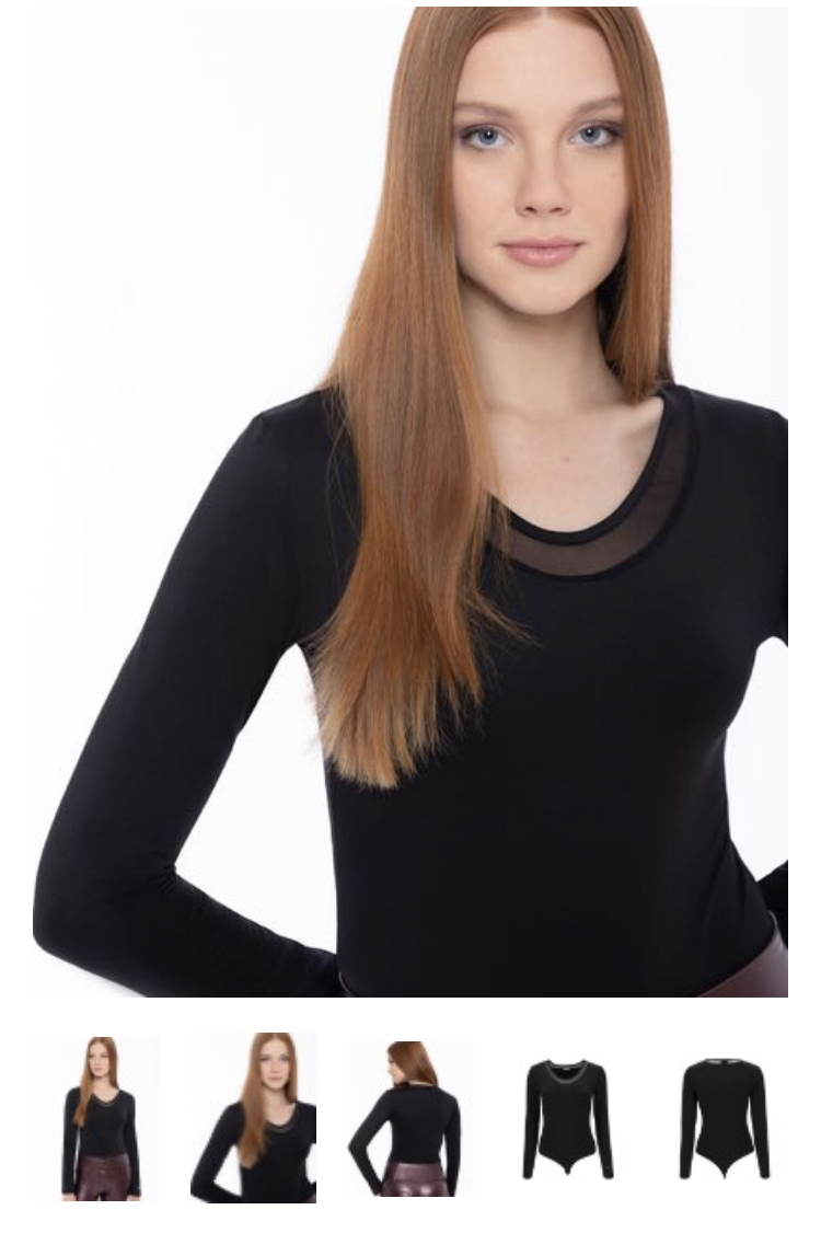 この黒いストレッチボディスーツは、クルーネックのチアチュールイ​​ンサートが特徴です。