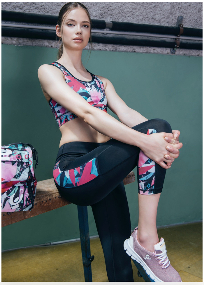 こちらのモデルは、ベルトにマイクロポケットが付いたハイウエスト、7/8の長さ、右脚に沿って花柄のテクスチャーのバンドを備えています。 脚の下部にある縦のシルバーの反射ロゴがスタイルのディテールを完成させます。