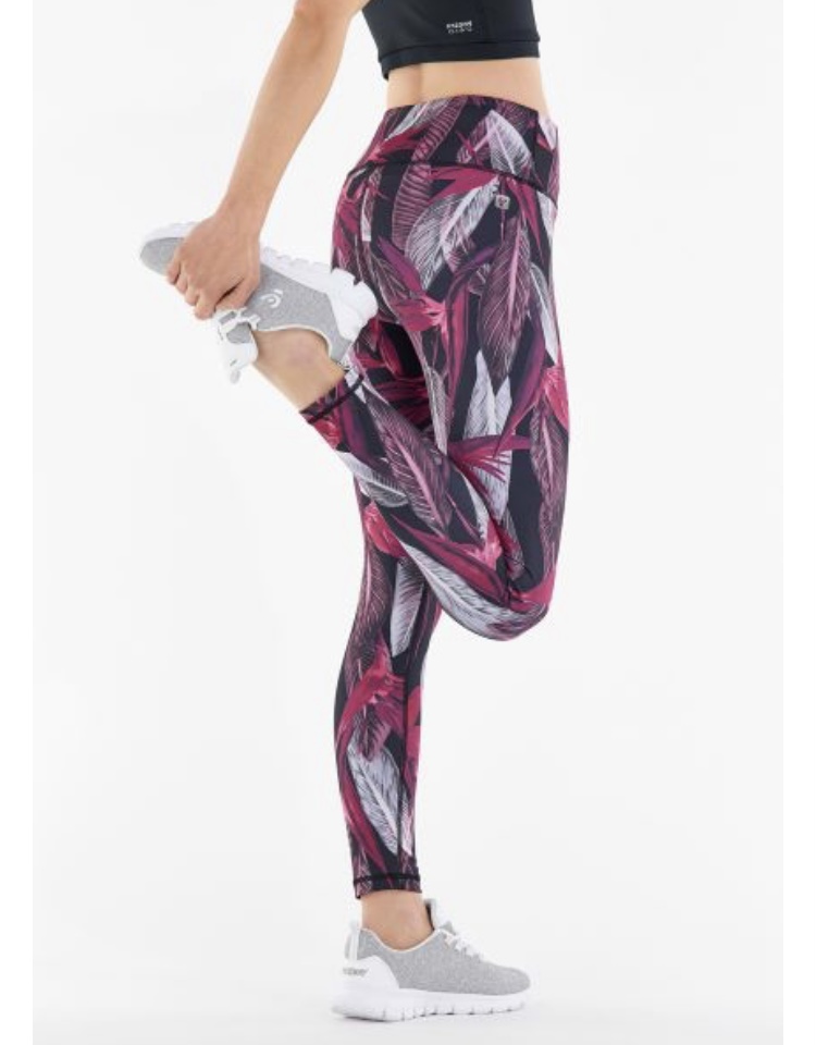 こちらのモデルは、全体が花柄でハイウエスト、丈は7/8、脚の下部にある縦のシルバーの反射ロゴがスタイルのディテールを完成させます。