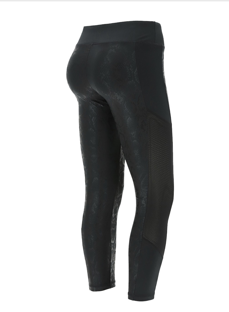 光沢のあるトーンオントーンのスネークフェイクレザーとメッシュインサートを備えた通気性の高いD.I.W.O.®パフォーマンスファブリックのアスレチックレギンス。