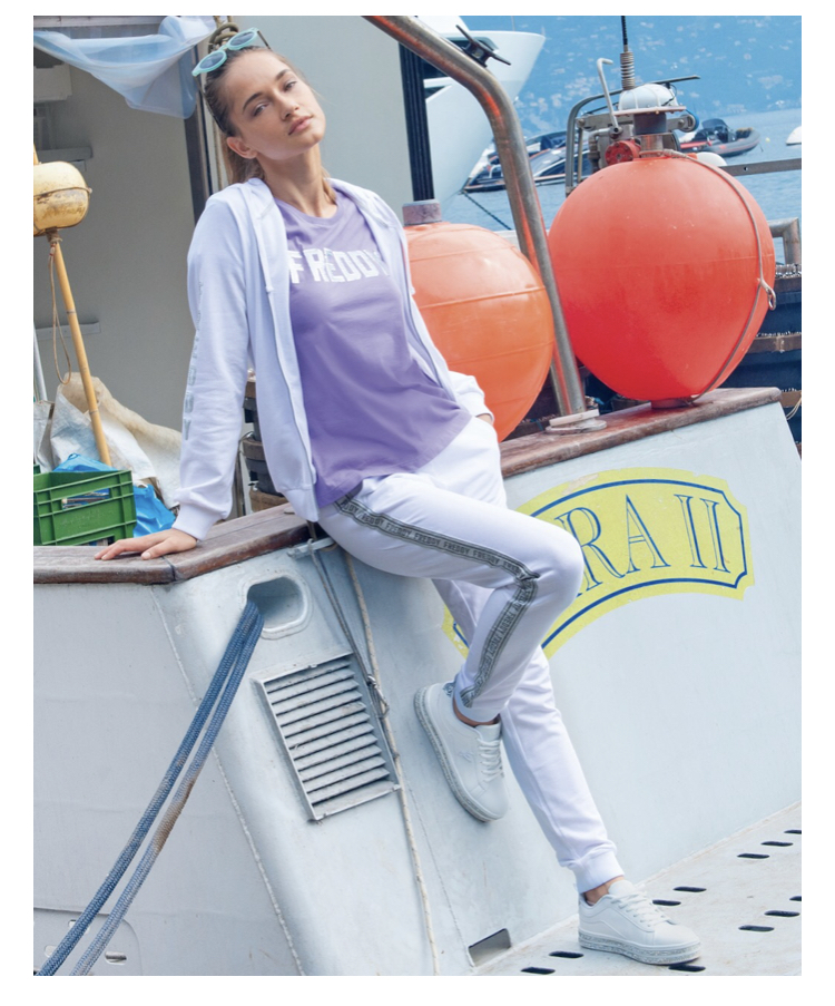 2色のシルバーのルレックスで作られた側面にFREDDYジャカードバンドで装飾された軽量フリースのアスレチックパンツ。
