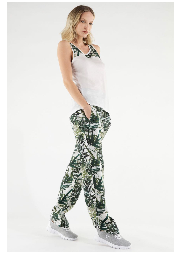 植物繊維を全面に使用したトロピカルな葉柄のワイドレッグパンツ。