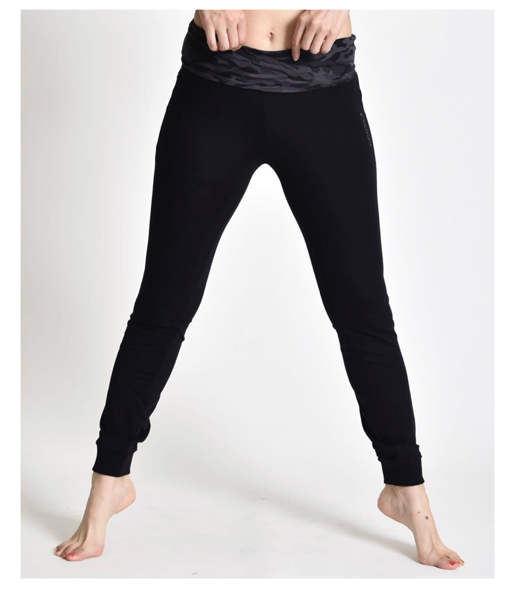 カモフラージュ柄のワイドウエストバンド仕様のおしゃれなハイウエストパンツ。