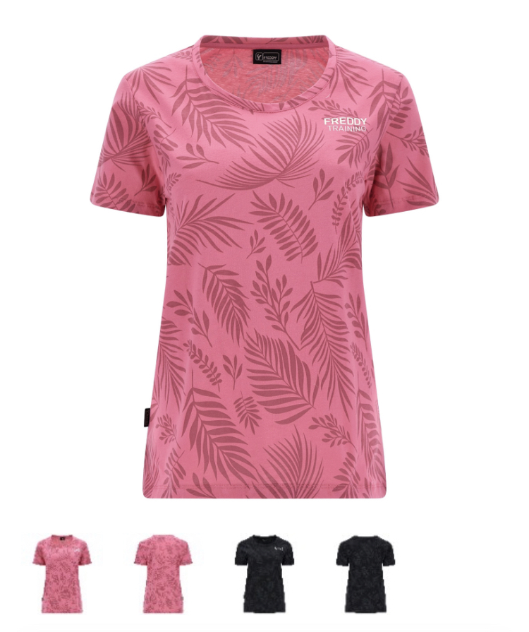April 1, 2023 半袖Tシャツ 熱帯の葉の総柄をプリントしたコットンジャージー製のコンフォートフィットTシャツです。クルーネック、ショートスリーブ、サイドスリット入りのストレートヘムです。ハート部分に施された小さなライトゴールドのFREDDYプリントが、ルーズフィットで自然な柔らかさを持つこのウェアのスタイルディテールを完成させています。エキゾチックな色合いで、自由な着こなしができる万能な一着です。 FLO48=ライトピンク FLO43=ブラック 100%コットン