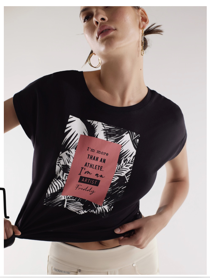 あなたの中のアーティスティックムーブメントを呼び起こすFREDDYブラックコンフォートフィットTシャツ。こちらのモデルは、シルクのような光沢のあるソフトで軽いジャージーマティリアルが使用されとても着心地が良く、ラウンドネック、ショートウイングスリーブ、ストレートヘムが特徴です。またNEWモデルのこちらのTシャツはフロントとバックを交換することも可能で、片面は、カラーボックスにルーフのテクスチャーとブラックグリッターロゴでデザインされ、もう片面には、コントラストカラーとシルバーグリッターのタイポグラフィック「MAKE IT HAPPEN」がデザインされています。エネルギッシュで質の高いトーンのこちらのウエアは、ゆったりとしたデザインと生地の肌触りの良さにより、スポーツから日常まであらゆるシーンで快適な着心地を実現した一着です。