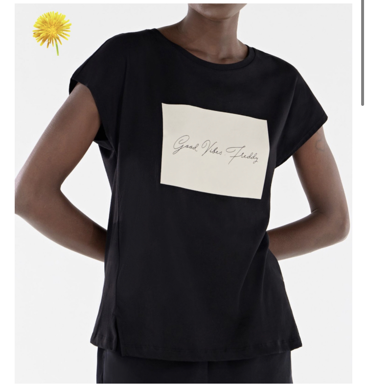 FREDDYのシグネチャー「Good Vibes FREDDY」タイポグラフィックが入った、コントラストカラーのボックスがあしらわれたモダールジャージーのTシャツです。クルーネック、キャップスリーブ、サイドスリットの入ったやや細めの裾、バックネックの下に施されたローズゴールドのロゴが特徴的なモデルです。流れるようなラインのデザイン、体のラインにソフトに沿うレギュラーフィット、肌触りの良い生地により、FREDDYのポジティブな波動に満ちた快適さを好むあらゆるシーンで快適に着用できる服となっています。