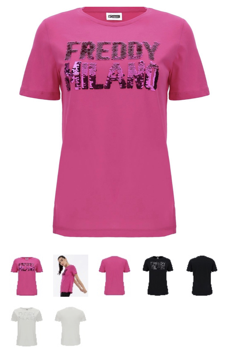 April 4, 2020 半袖Tシャツ クルーネックラインとサイドベント付きのストレートニットヘムを備えた半袖Tシャツ。軽いジャージで快適なフィット感。 胸にはFREDDY・MILANO(ミラノ)がスパンコールで装飾されています。 綿100% F49:ピンク N:ブラック W:ホワイト