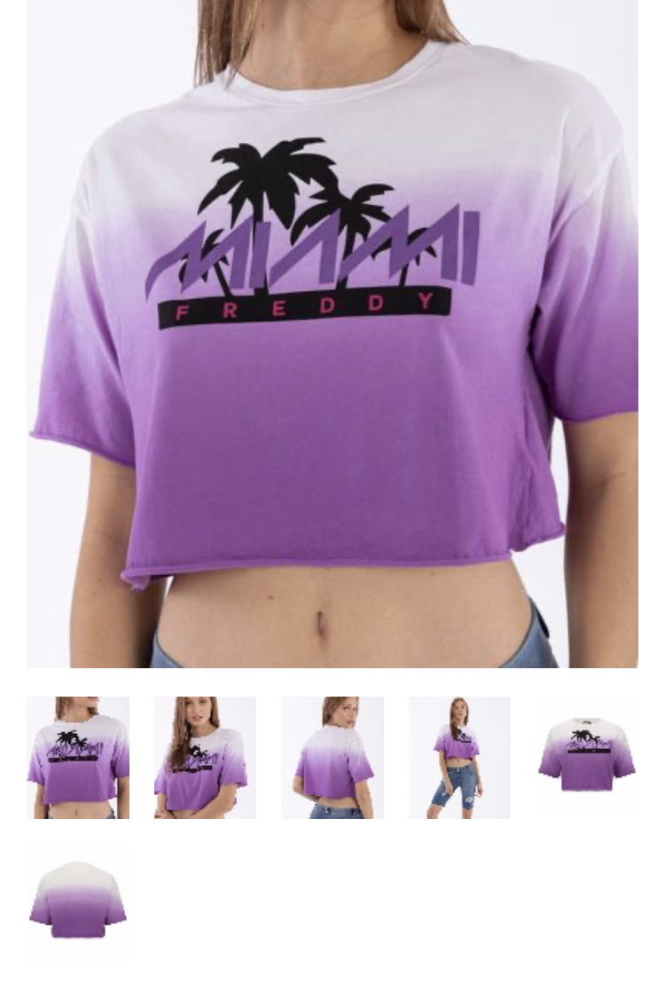 July 25, 2020 半袖Tシャツ クルーネックのラインと袖のようなカットボトムがウエストを強調するクロップドTシャツオーバーサイズフィット。 白と紫のツートンカラーのデグラード効果と胸にヤシの木が描かれた “FREDDYマイアミ”グラフィックは、トロピカルなビーチの味わいを装います。 綿100% WE53 =パープルグラデーション