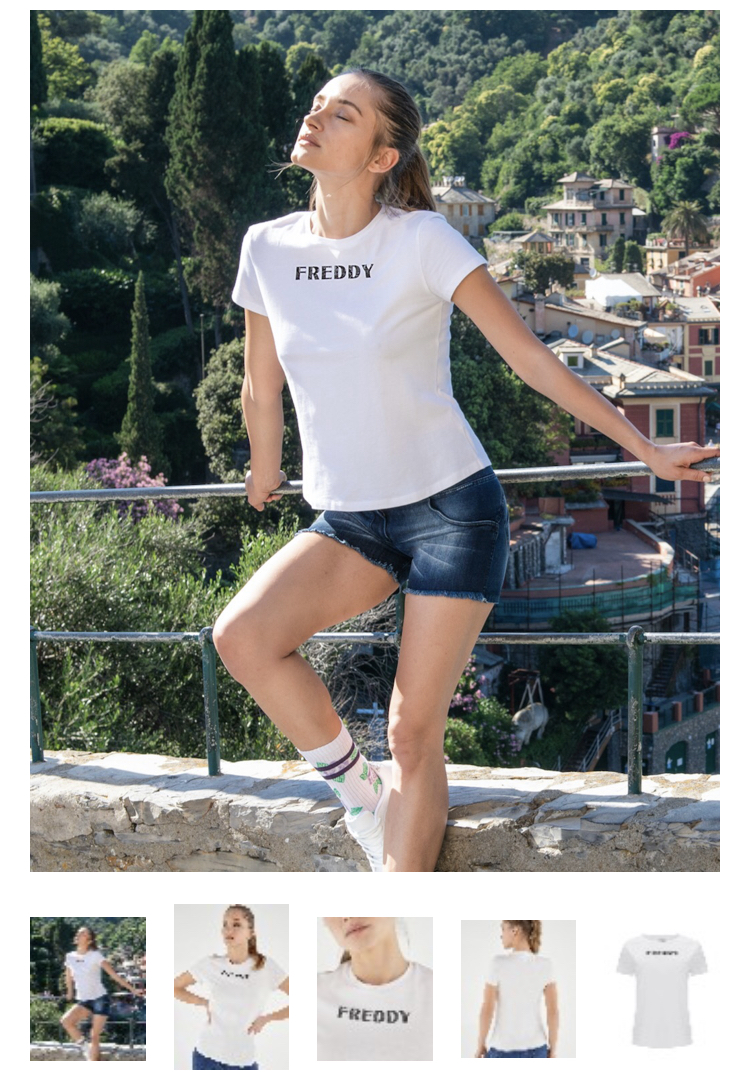 胸にコントラストのあるスネーク柄のFREDDYロゴが入った白い半袖クルーネックストレッチジャージーTシャツ。