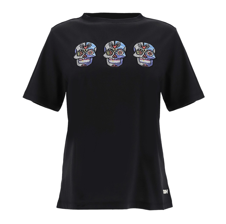 3つのスカルのパッチモチーフで飾られたブラックモーダルジャージーのコンフォートフィットTシャツ。 ロメロ・ブリットコレクションのエネルギーが特徴のウエア。洗練されたカラーとポジティブさを醸し出す大胆なモチーフで有名なネオポップアーティストが、刺繡とアプリケーションが豊富なパッチで作られたカラフルなグラフィックの作成でFREDDYのコンセプトを表現しています。