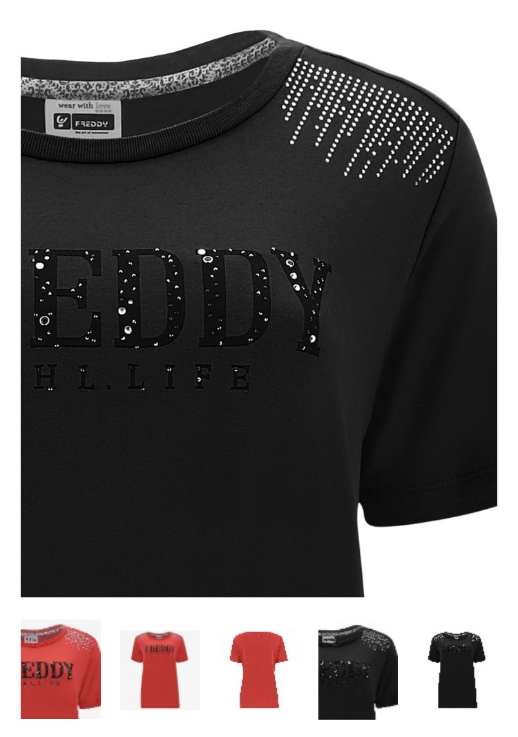 ストレッチビスコースジャージーTシャツは、フロントにブラックのFREDDY ATHLETIC LIFEロゴを施し、さまざまなサイズのラインストーンと肩にリニアシルバーのラインストーンモチーフ、デザイン性と快適さを評価するウエアとして最適です。 モデルは広くて丸いネックライン、ストレート裾仕様。 個性豊かで華やかな色合いのウエアで、特に自然な光沢とサテンの色調が特徴の生地の心地よい柔らかさと柔軟性のおかげで、着心地がとても良いウエアです。スポーツシーンから日常まで様々なシーンでご利用頂けます。 コットン96% エラスタン4% R112=レッド N=ブラック W72=ホワイト