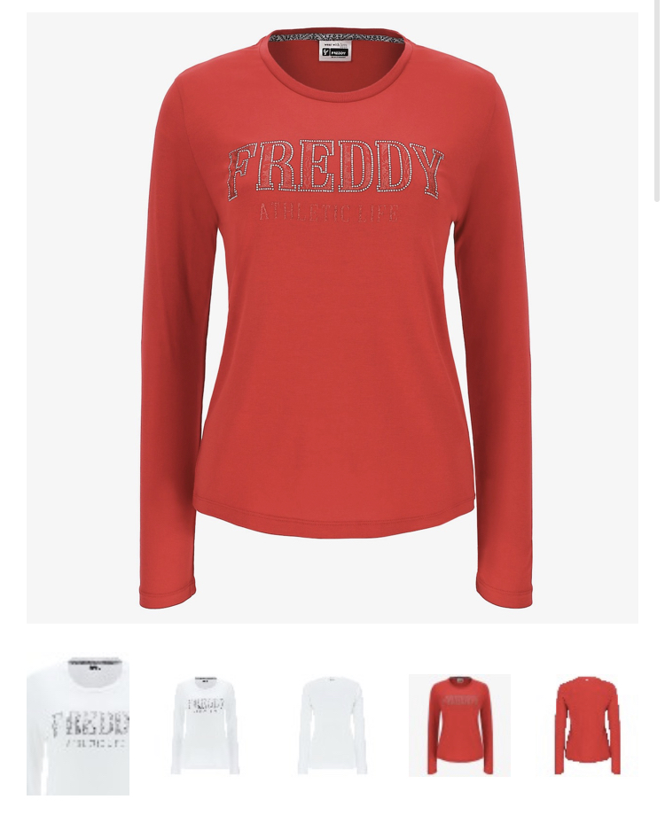 October 20, 2021 長袖Tシャツ FREDDY ATHLETIC LIFEのフロントロゴにダマスク柄とラインストーンの縁取りが施されたシルバーのグリッターで装飾された、ストレッチビスコースジャージーの長袖Tシャツ。 装飾の明るいトーンは、動きの振幅を与えることができる柔軟な生地の光沢のあるサテンの表面と調和して絡み合っています。 着心地の良いウエアで、スタイルの名の下に快適さの喜びを感じさせてくれるウエアです。 ヴィスコース 94% エラスタン6% W72=ホワイト R112=レッド N=ブラック