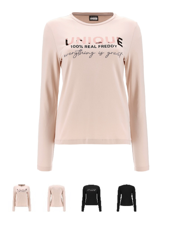 フロントに光沢のあるミクストメディア(メタリック+グリッター)で装飾された軽量ストレッチジャージーのレギュラーフィット長袖Tシャツ。 ラウンドネック、ストレートヘムライン。 生地の柔らかなしなやかさで動きやすさを追求し、丈夫で着心地の良い着こなしです。