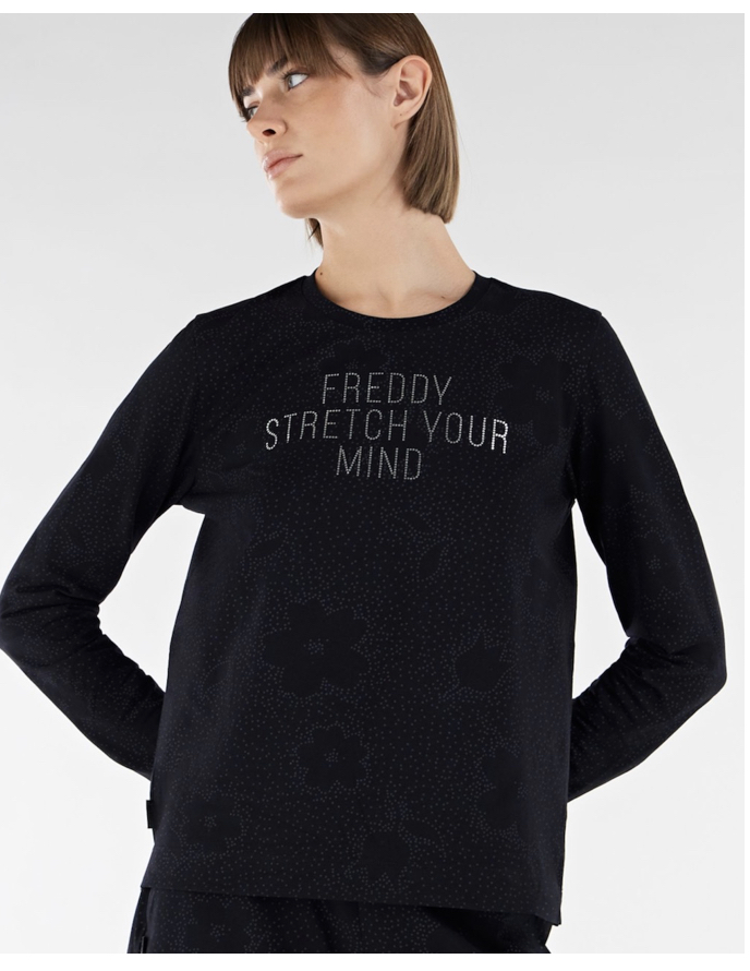ヘビーストレッチジャージー製のトレーナーです。同系カラーのドットで全体を🌼🌼フラワー柄🌼🌼でデザイン、フロントはシルバーカラードットロゴで装飾したエレガントな一枚に。クルーネックで、同系色の光沢のあるラバーで縁取りしたストレートスリーブ、サイドスリットの入ったストレートヘムが特徴です。袖の下にはシルバーのFREDDYロゴが施され、快適で多目的に使えるこのウエアは、スポーツからダイナミックなフリータイムまで、自由な動きとスタイルを楽しむあらゆるシーンに最適です。